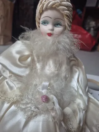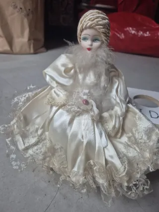 Deliziosa bambola in ceramica con un elegante vestito in seta color avorio. - Dettagli del viso dipinti a mano. - Cappello decorato con fili dorati. - Orlo del vestito rifinito con pizzo. - Collo adornato con pelliccia sintetica.