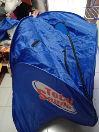 Sauna portatile di colore blu con logo Total Sauna. Richiedibile nella sua sacca portatile - Struttura in tessuto. - Apertura con cerniera.