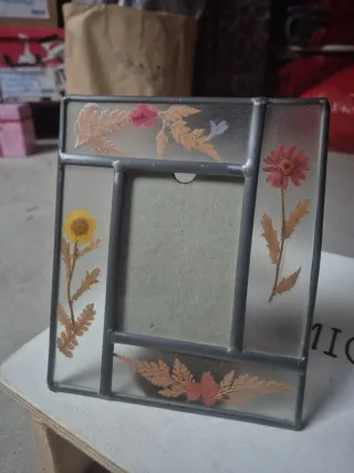 Elegante portafoto realizzato in vetro e ferro, impreziosito da fiori secchi. - Design unico con fiori pressati. - Cornice in metallo resistente. - Vetro trasparente e decorato. - dimensione foto 6x8,5