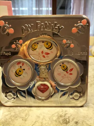Elegante portafoto My Family della linea Luxury di Valenti & Co. Perfetto per conservare i ricordi più preziosi. - Design decorato con api e fiori. - Cornice in metallo argentato. - Include più spazi per foto.