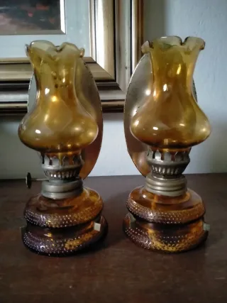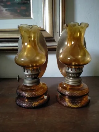 Set di due lampade ad olio vintage risalenti agli anni '60. Presentano una base in vetro ambrato con dettagli puntinati e un paralume con bordo ondulato. La struttura dietro in metallo permette di appenderle oppure si può togliere. Mai state usate, all'interno lo stoppino è ancora nuovo.