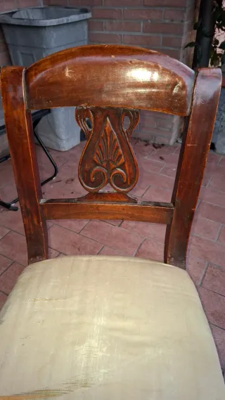 Elegante sedia stile Restaurazione italiana, risalente al periodo tra il 1815 e il 1850. Un pezzo d'antiquariato con dettagli raffinati. Da restaurare con restauro conservativo. - Struttura in legno scuro lavorato manualmente - Seduta e schienale intagliato con finitura dorata dorata