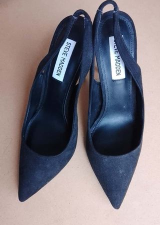 Eleganti tacchi neri con punta a stiletto e cinturino posteriore. - Materiale scamosciato. - Design a punta. - Modello slingback. - Numero 37