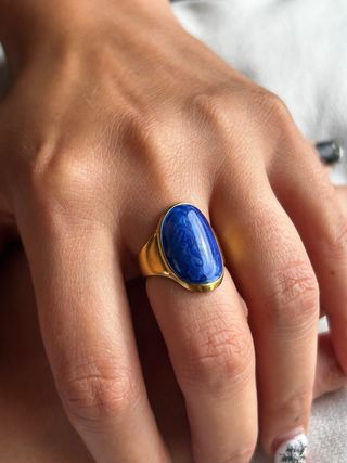 Elegante anello con finitura dorata e un vivace inserto in smalto blu. - Design ovale. - Dettagli luminosi nello smalto.