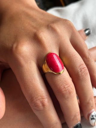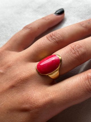 Elegante anello con finitura dorata e un vivace smalto rosso. - Design ovale dello smalto. - Montatura in acciaio.