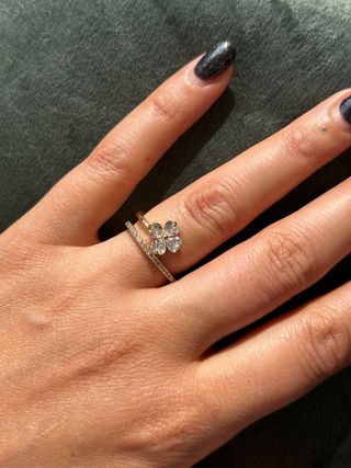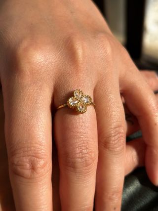Elegante anello dorato con design a quadrifoglio. Un accessorio che aggiunge un tocco di stile. - Dettagli a forma di quadrifoglio. - Pietre luminose incastonate.