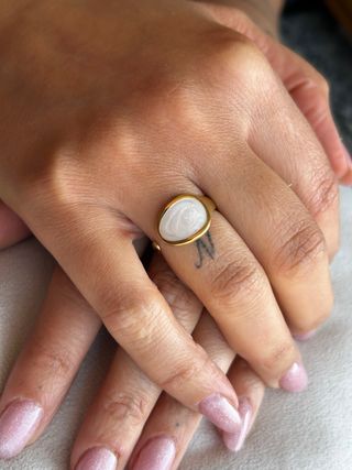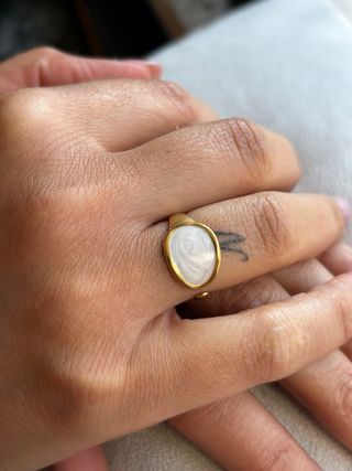 Anello vintage con finitura in acciaio inossidabile. - Design regolabile per una vestibilità comoda. - Dettaglio centrale con finitura marmorizzata bianca e oro.