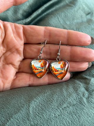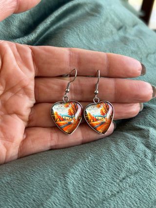 Deliziosi orecchini pendenti a forma di cuore con un bellissimo paesaggio autunnale. - Design a cuore. - Immagine di un paesaggio autunnale con alberi e strada.