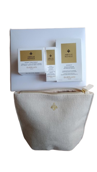 Experience the luxury of French skincare with this Guerlain Abeille Royale set. It includes three premium minis from the Abeille Royale collection, housed in a soft ivory zip pouch with a gold bee emblem. Ideal for gifting, travel, or sampling the line. Set includes: Double R Renew & Repair Advanced Serum (7 x 0.06 fl oz) Honey Treatment Day Cream (7 ml / 0.23 oz) Youth Watery Oil (5 ml / 0.16 oz) Ivory zip pouch with satin lining and Guerlain-branded tissue paper. All items are brand new and unused.