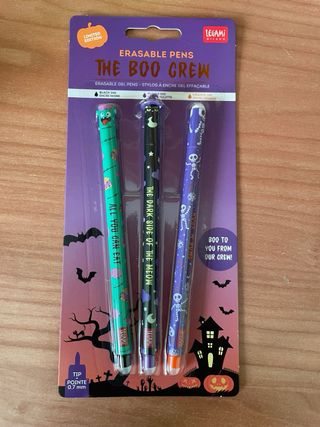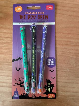 Set di 3 penne gel cancellabili Legami in edizione limitata a tema Halloween. - Design The Boo Crew. - Inchiostro nero, viola e arancione. - Punta da 0.7 mm.