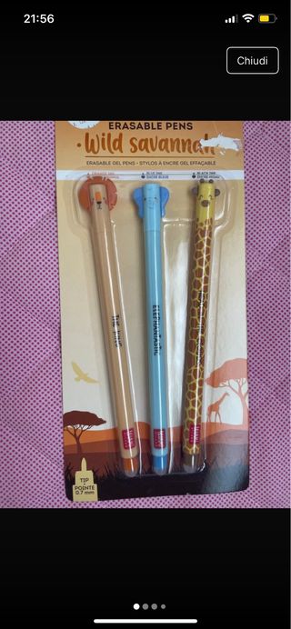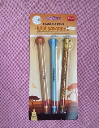 Set di penne cancellabili originali Legami con tema Wild Savannah. Perfette per chi ama scrivere e disegnare. - Design ispirato alla savana. - Inchiostro cancellabile. - Include penne con inchiostro blu e nero. segnalo solo lieve segno sulla confezione, visibile in foto, che non incide sul contenuto. prodotto in perfette condizioni internamente.