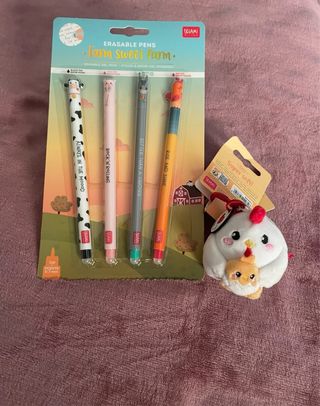 Set di 5 penne cancellabili Legami a tema Farm Sweet Farm. Perfette per chi ama scrivere e correggere con stile. - 4 Penne gel cancellabili. - Design a tema fattoria con simpatici personaggi. - Punta da 0.7 mm. - Include una penna con design a mucca (inchiostro nero), una rosa (inchiostro rosa), una grigia (inchiostro grigio) e una arancione (inchiostro rosso). - una simpatica gallinella portachiavi Super soft!.