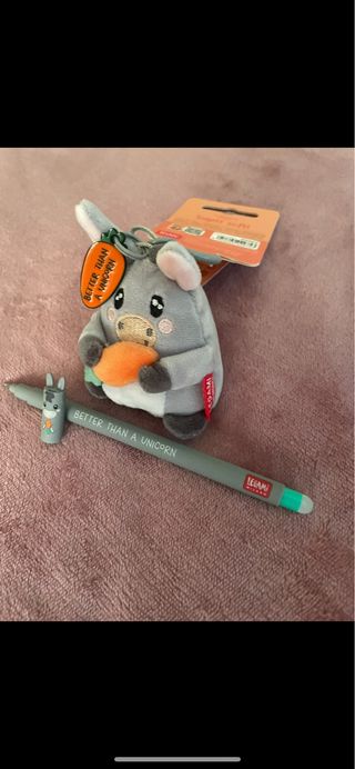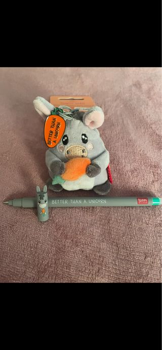 Set composto da due simpatici accessori a tema asinello originali Legami. - Portachiavi peluche soft plush asinello con carota. - Penna grigia con decorazione asinello e scritta BETTER THAN A UNICORN.