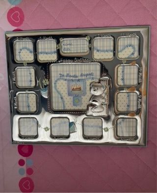 Elegante cornice portafoto per conservare i ricordi dei primi 12 mesi del tuo bambino. Realizzata in argento 925, presenta un design curato con spazi dedicati per ogni mese e una foto centrale. spazio per scrivere nome e data di nascita. - Design a fisarmonica per raccogliere 12 foto mensili. - Spazio centrale per una foto più grande nome e data di nascita - Dettagli decorativi a tema neonato. - Finitura in argento lucido, Marca De Santis argenti possibilità di appenderlo o di posizionarlo su una superficie, presenti entrambi gli annessi. in confezione originale, mai usata.