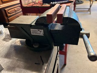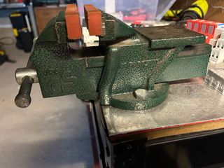 Morsa da banco in metallo verniciato di verde, con ganasce in gomma rossa. - Struttura solida e resistente. - Ideale per lavori di precisione. - Base girevole per un facile posizionamento.