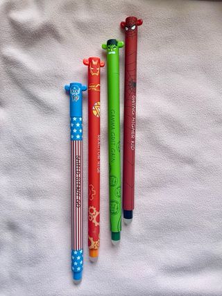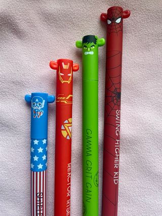 Set di penne a tema Marvel Avengers, ispirate ai personaggi. - Penna Capitan America con design a stelle e strisce. - Penna Iron Man con dettagli rossi e dorati. - Penna Hulk verde con espressione arrabbiata. - Penna Spider-Man rossa con ragnatela.