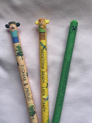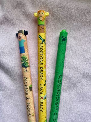 Set di 3 penne cancellabili a tema Minecraft, ispirato alle Legami, NON PRODOTTO UFFICIALE. compatibile con ricariche inchiostro. - Design ispirato ai personaggi e agli elementi del gioco. - Scrittura scorrevole e cancellabile.