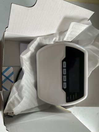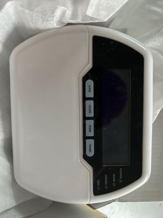 Sistema di allarme per la sicurezza domestica. Il dispositivo è di colore bianco e presenta un display digitale. - Pulsanti di navigazione. - Indicatore luminoso. - Porta di connessione.