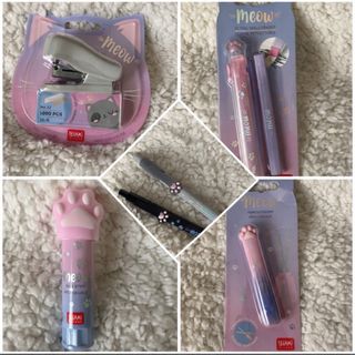 Set di cancelleria Legami con tema Meow. Include diversi articoli per la scuola o l'ufficio. - Mini spillatrice con punti - Gomma retrattile con ricarica - 2 Penne - Forbici - Colla stick.
