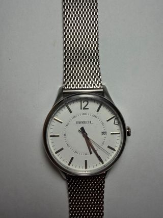 Orologio Breil modello TW1561, bellissimo orologio collezione CONTEMPO, movimento Quarzo analogico, resistente all'acqua 5ATM, cassa in acciaio, quadrante bianco, diametro 40,5 con 3 lancette, vetro minerale, chiusura a scorrimento, cinturino magli milanese in acciaio lucido. L'orologio presenta un'unico difetto come si mostra nella ultima foto, ossia il quadrante che contorna il giorno del mese é staccato, problema risolvibile con un'orologiaio. Sostituire la batteria