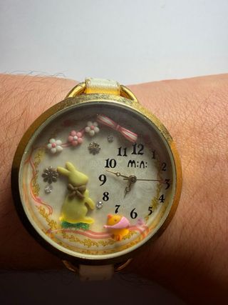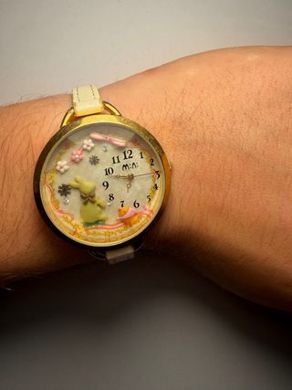 Orologio M:N: Mini Miniature Watch Designed by Korea; Bellissimo orologio da donna resistente all'acqua 3ATM, quadrante con disegni 3D, cassa color oro e cinturino sottile color panna, orologio usato poche volte, presenta piccoli segni di usura sul cinturino, sostituire la batteria.