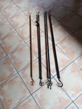 Set di bastoni per tende con finiture decorative. - Bastone principale in color oro con finitura a spirale. - Tre bastoni in color nero con dettagli in metallo lavorato e una corda legata a uno di essi.