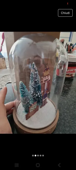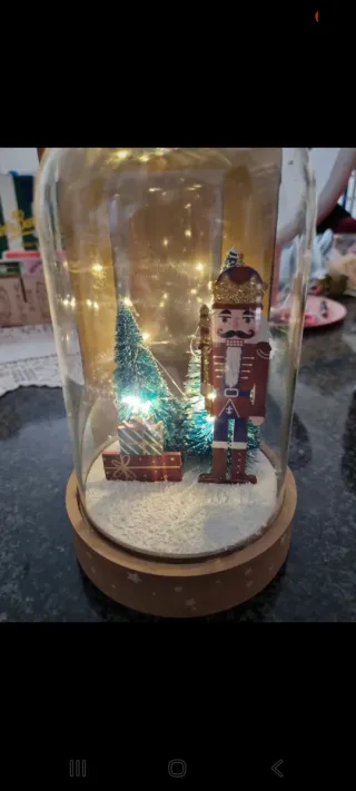 Deliziosa campana in vetro decorativa a tema natalizio. Al suo interno, un simpatico soldatino di legno, un alberello e pacchi regalo, il tutto illuminato da luci LED che creano un'atmosfera magica. - Base in legno decorata con stelle. - Soldatino con dettagli colorati. - Alberello verde brillante.