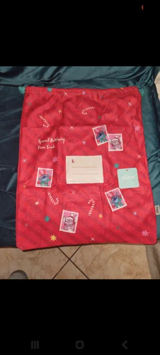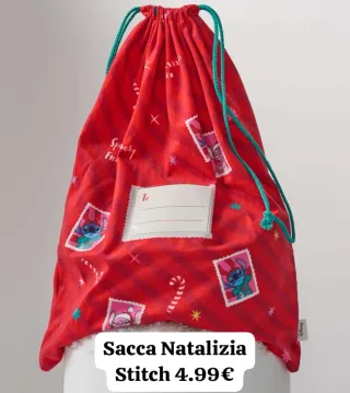 Simpatica sacca regalo a tema Stitch, perfetta per il periodo natalizio. Il design a tema natalizio con Stitch la rende un'idea regalo divertente. - Colore rosso con stampe a tema. - Chiusura con cordoncino. - Etichetta porta nome inclusa.