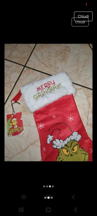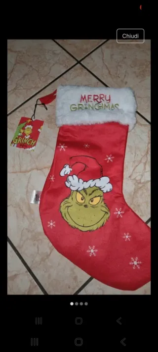 Calza natalizia a tema Grinch, perfetta per le feste. - Decorata con il personaggio del Grinch. - Bordino bianco in pelliccia sintetica. - Fantasia di fiocchi di neve.