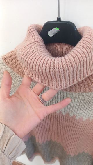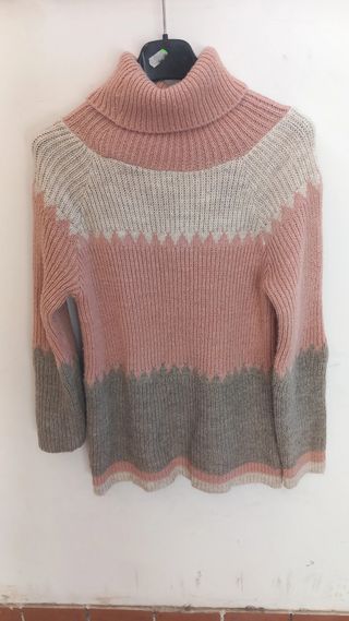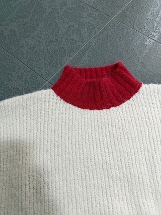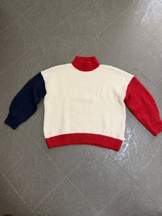 Maglione a collo alto con un design color block. - Maniche blu navy e rosso. - Corpo bianco. - Polsini e fondo a coste rossi.