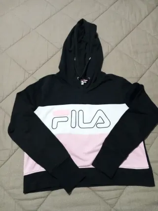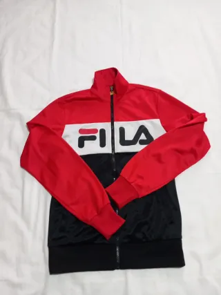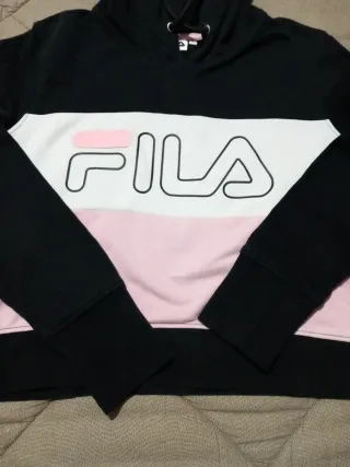 Felpa Fila con un design a blocchi di colore. - Maniche rosse. - Pannello bianco con logo Fila. - Corpo nero.