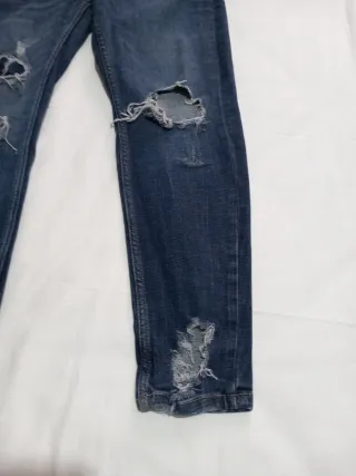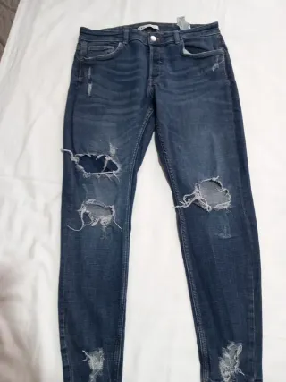 Jeans da uomo Zara con un look moderno e grintoso. - Design con strappi evidenti sulle ginocchia e sul fondo. - Vestibilità slim fit. - Chiusura con bottoni.