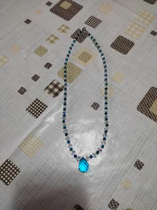 Elegante collana da donna con un pendente centrale a goccia di cristallo blu intenso, circondato da perline blu e trasparenti. Lavorazione a mano - Pendente a goccia sfaccettato. - Design raffinato.