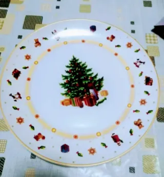 Set composto da un piatto e una paletta con un bellissimo design natalizio. - Decorazioni a tema albero di Natale e regali. - Bordo decorato con elementi festivi. - Manico della paletta con fantasie a quadretti.