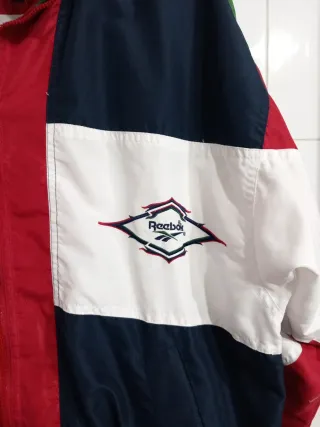 Felpa da uomo vintage Reebok con chiusura a zip. Un capo dallo stile unico e colorato. - Vestibilità larga lunghezza cm 69 - Design a pannelli. - Collo alto. - Polsini e fondo elasticizzati.