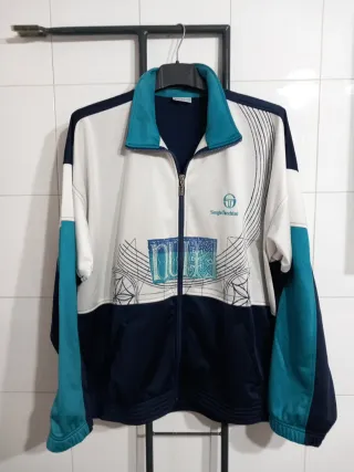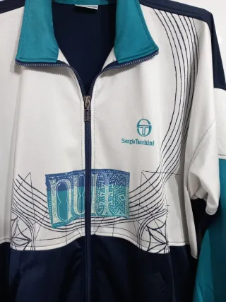 Felpa da uomo vintage Sergio Tacchini con un design unico. - Colori bianco, blu navy e verde acqua. - Logo Sergio Tacchini sul petto. - Zip frontale.