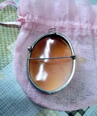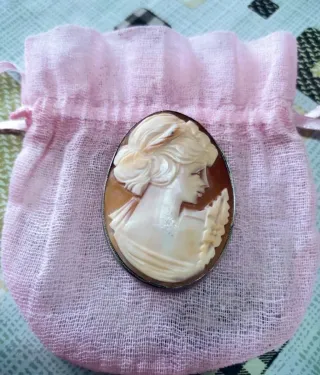 Bellissima spilla vintage con un classico intaglio di una figura femminile. Da poter usare anche come ciondolo. Provenienza Torre del Greco. - Design ovale. - Dettagli finemente lavorati.