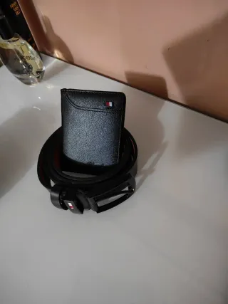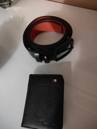Set composto da cintura da uomo e portafoglio. - Cintura in pelle nera, lunghezza 120 cm. - Portafoglio in pelle nera con logo.slardar - Dettaglio tricolore sulla fibbia della cintura e sul portafoglio.