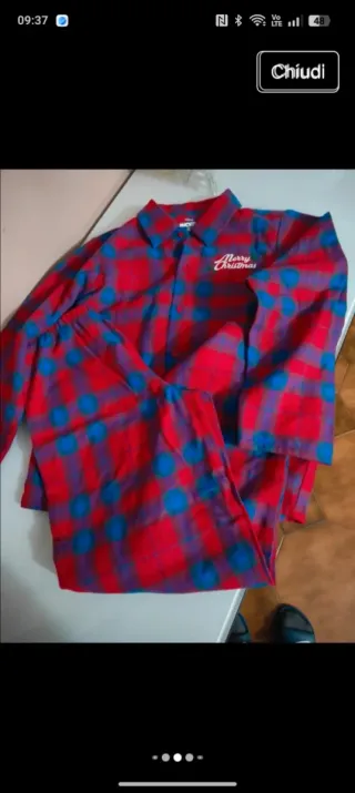 Pigiama Disney a quadri rossi e blu con stampa di Topolino e Minnie. Ideale per bambini. - Stampa di Topolino e Minnie con cappellini natalizi. - Scritta Wanna Celebrate with Me? - Tessuto a quadri rossi e blu.