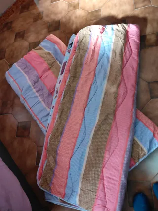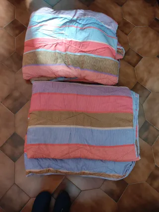 Set di due piumoni singoli, ideali per la cameretta. Presentano un design a righe colorate.duble dance un piumone un piccolo difetto un pochino scolorito il colore foto mostrato - Fantasia a righe orizzontali. - Tessuto in poliestere.