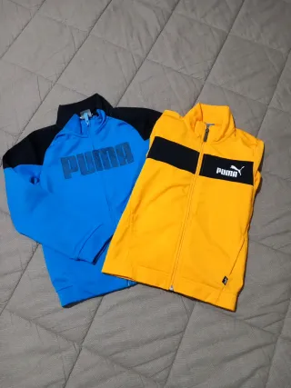 Set di due felpe Puma per bambino, taglia 7/8 anni. Una felpa è blu con logo Puma nero stampato, l'altra è gialla con banda nera e logo Puma bianco. - Felpa gialla con banda nera sul petto. - Logo Puma su entrambe le felpe.