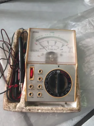 Multimetro analogico marca DK. - Modello TS-2560-00. - Misure OHMS, AC, DC. - Cavo con puntali incluso. Il multimetro analogico DK-500 visualizzato nell'immagine è uno strumento di misura che, in base alle impostazioni correnti, mostra un valore di circa 10 Ω (Ohm) sulla scala delle resistenze. Analisi della lettura Lo strumento è impostato per misurare la resistenza (OHMS), come indicato dalla scala superiore in verde. Il selettore di portata (non visibile nell'immagine completa, ma deducibile) è probabilmente impostato su un moltiplicatore, ad esempio ACCETTO OFFERTE VALIDE
