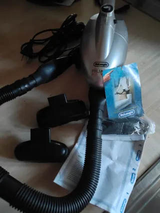 Mini aspirapolvere DeLonghi PIUMA, ideale per pulizie rapide. - Colore argento. - Include accessori. - Tubo flessibile.
