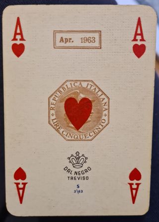 Due mazzi di carte da collezione risalenti all'aprile 1963. Dal Negro Modello San Siro , mazzi completi da 55 carte, inclusi Jolly e carte del punteggio internazionale. Qualche lieve segno del tempo. La custodia è più usurata. Punzone della Repubblica Italiana con bollo da 500 lire. Stupendo oggetto da collezione. - Carte Repubblica Italiana L. 500. - Data di produzione: Aprile 1963. - Produttore: Dal Negro, Treviso.