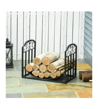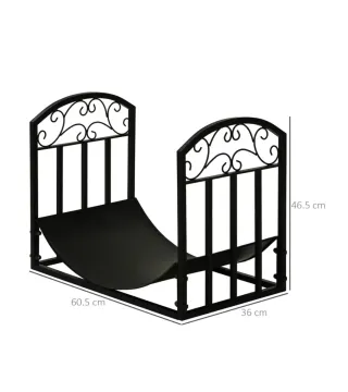 Elegante portalegna in metallo, adatto sia per interni che per esterni. Il suo design in ferro battuto con decorazioni a ricciolo aggiunge un tocco di classe. - Materiale: Metallo - Colore: Nero - Stile: Classico con decorazioni