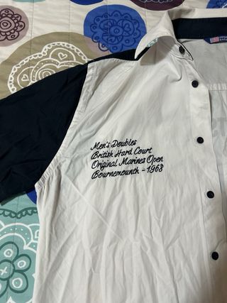 Camicia da uomo a mezza manica con dettagli ricamati sul petto e maniche in contrasto. - Ricamo Men's Doubles British Hard Court Original Marines Open Bournemouth - 1963 - Patch circolare sul petto con figura - Colletto classico - Chiusura con bottoni neri
