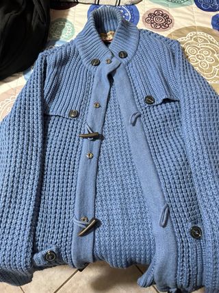 Cardigan da uomo in maglia grossa, perfetto per un look casual. - Chiusura con bottoni e alamari. - Collo alto a costine. - Tasche frontali applicate.