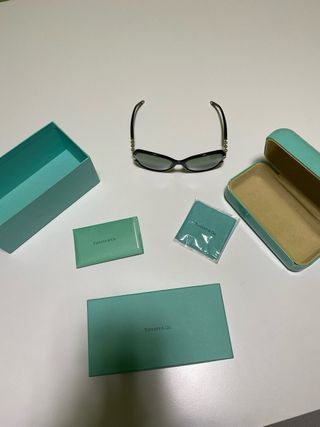 Occhiali da sole Tiffany & Co. completi di tutti gli accessori originali. - Montatura nera con dettagli color teal. - Lenti scure. - Include scatola, custodia e panni per la pulizia.