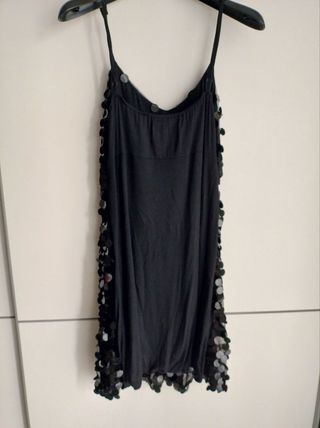 Vendo abito nero in pailette, senza maniche, lunghezza al ginocchio, perfetto anche per balli di coppia. Molto comodo da indossare e perfetto per donne stagione inverno. Nel retro non ha le paillettes, rendendolo più comodo. Taglia M