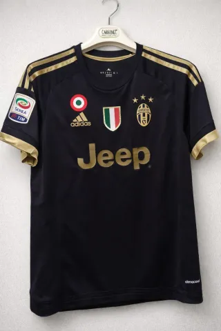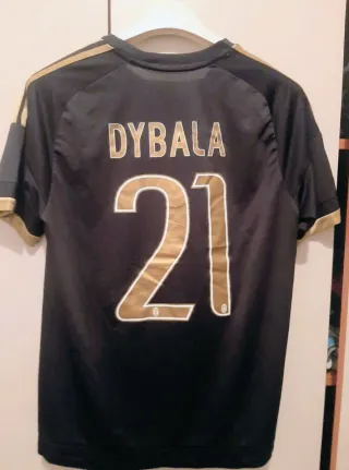 Camiseta de fútbol Adidas de la Juventus, talla M. Modelo de local con detalles dorados. - Escudo de la Juventus con 3 estrellas. - Logo de Adidas. - Parche de la Serie A TIM. - Número y nombre de Dybala #21. - Tecnología climacool.